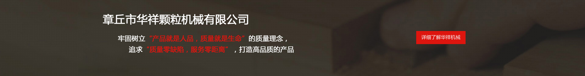 公司成立于1997年,前身為章丘市華祥機械廠(主營:顆粒機,飼料顆粒機,有機肥造粒機,有機肥設備,木屑顆粒機,顆粒生產線等), 公司是集機械制造,成套設備設計,安裝于一體的現代企業,由鑄造、機械加工、合成組裝、設計開發、網絡營銷五個聯合單位構成。主要生產飼料加工機械,生物質燃料機械,有機肥生產設備三大系列產品。 華祥機械牢固樹立“產品就是人品,質量就是生命”的質量理念,追求“質量零缺陷,服務零距離”,打造高品質的產品。 精心的設計、精湛的制造、精細的施工、全方位的服務,以及華祥人長期秉持“讓我們共同前進”的理念,使華祥贏得了良好的社會信譽,產品遠銷意大利、越南、緬甸、澳大利亞等全球多個國家和地區,產品質量和信譽得到了廣大用戶的認可。 未來,華祥人將繼續大力發揚"誠信、創新、協作、效率"的企業精神,堅持技術、產品、管理、服務創新,大力推進產品精品化和市場國際化,全力打造“華祥”機械品牌形象。想客戶所想,為客戶創造價值,協助客戶的事業獲得成功;"華祥"人充滿信心,滿懷希望,真誠期待與您共贏。